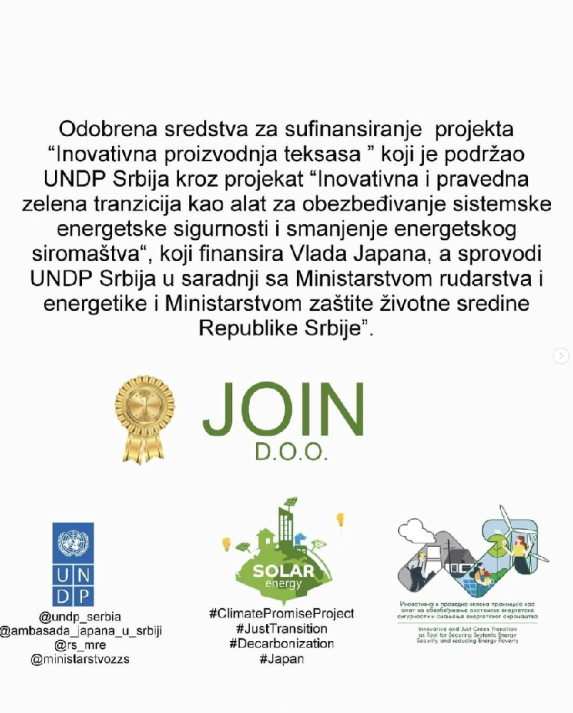 U okviru UNDP projekta Inovativna proizvodnja teksasa osvojili smo prvo mesto i obezbedili ukupno 100.000 evra za realizaciju, od čega je 50.000 evra stiglo kao podrška Vlade Japana, dok smo preostalih 50.000 evra uložili sami. Ovo nam je omogućilo da započnemo ozbiljan proces modernizacije i prelaska na obnovljive izvore energije. Projekat je postao početna tačka našeg dugoročnog puta ka održivosti.
