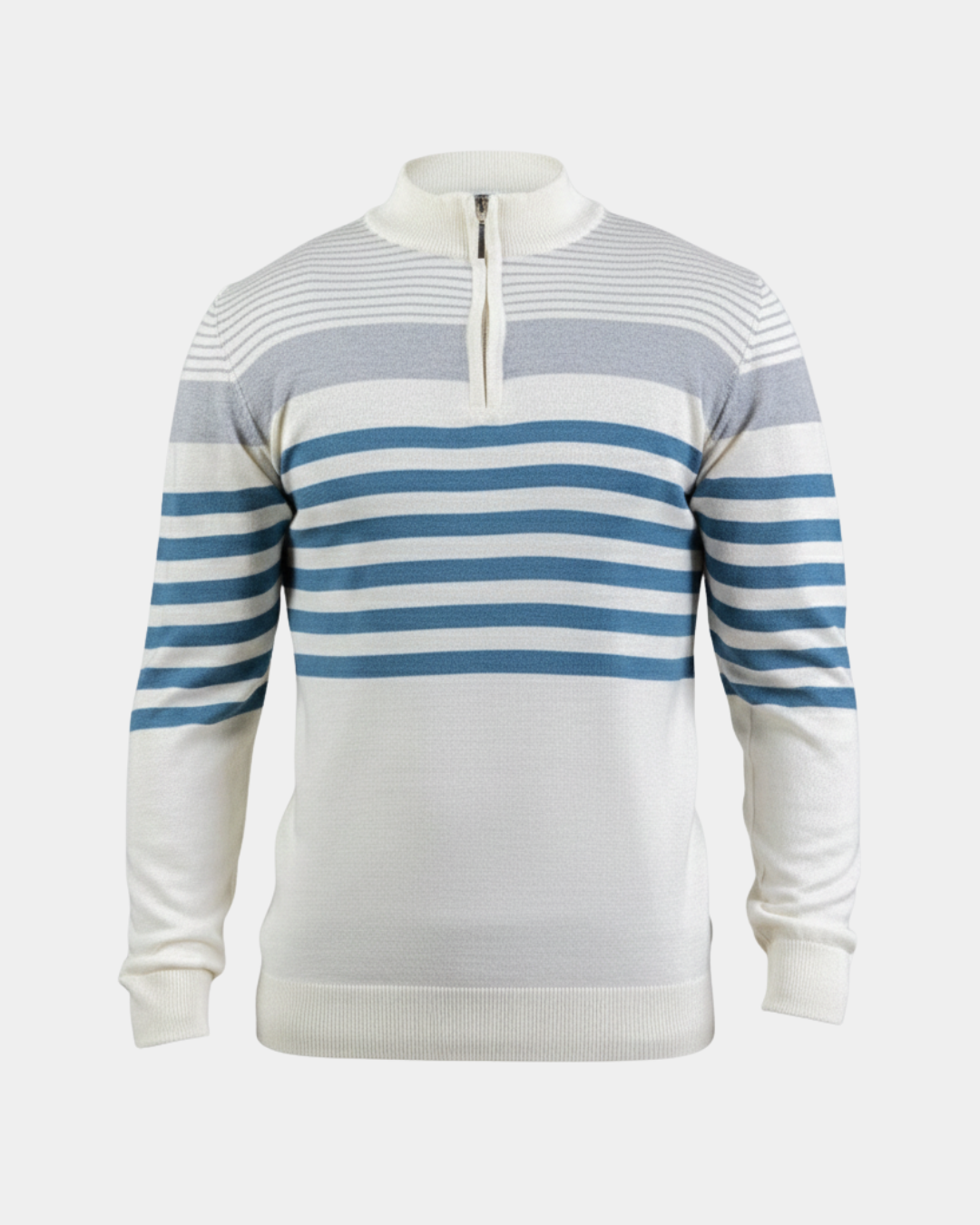 Muški džemper sa polu-zip zatvaračem izrađen od mešavine akrila i vune, koji pruža toplinu, mekoću i dugotrajnost. Moderan prugasti dizajn i udoban kroj čine ga odličnim izborom za svakodnevno nošenje.