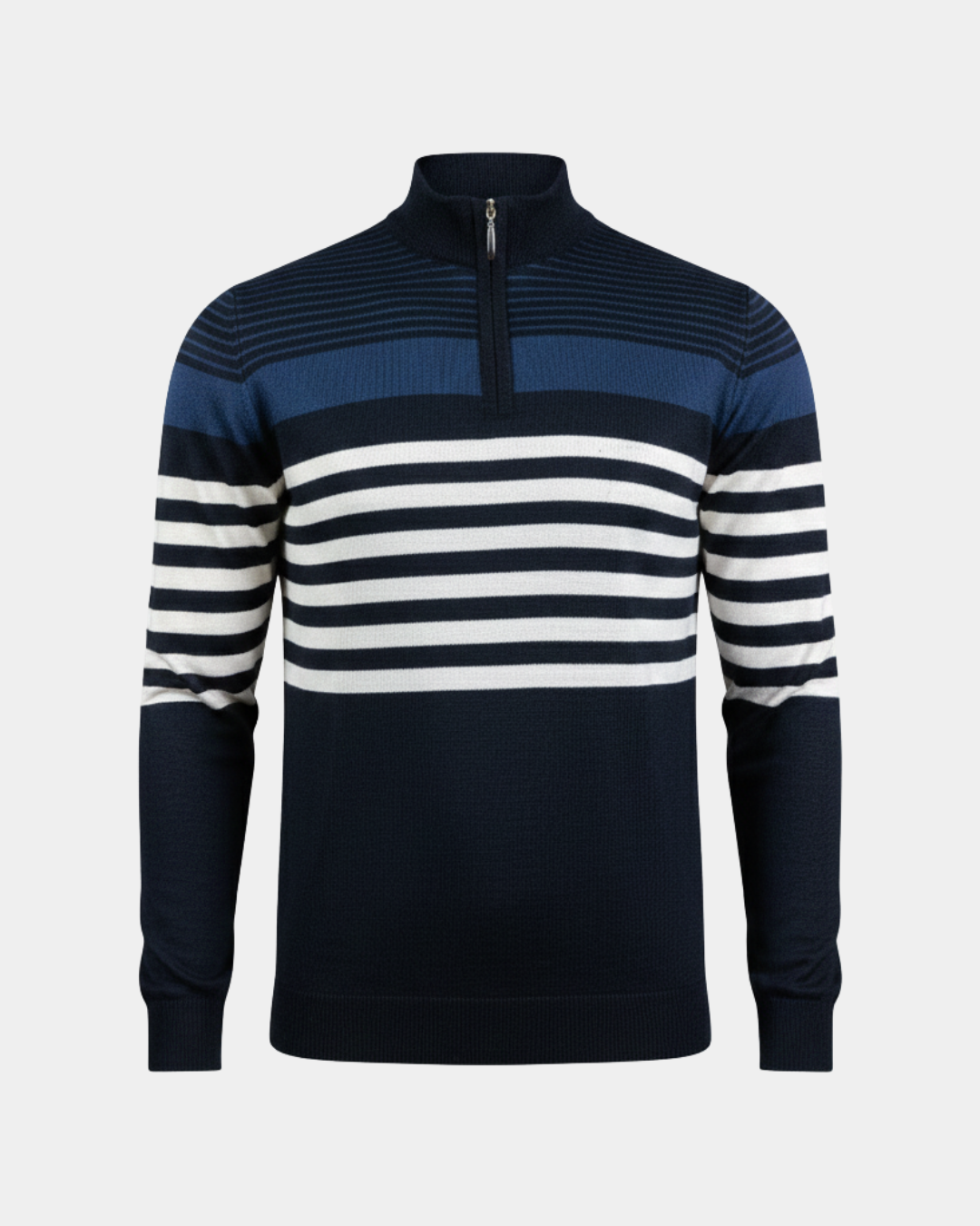 Muški džemper sa polu-zip zatvaračem izrađen od mešavine akrila i vune, koji pruža toplinu, mekoću i dugotrajnost. Moderan prugasti dizajn i udoban kroj čine ga odličnim izborom za svakodnevno nošenje.