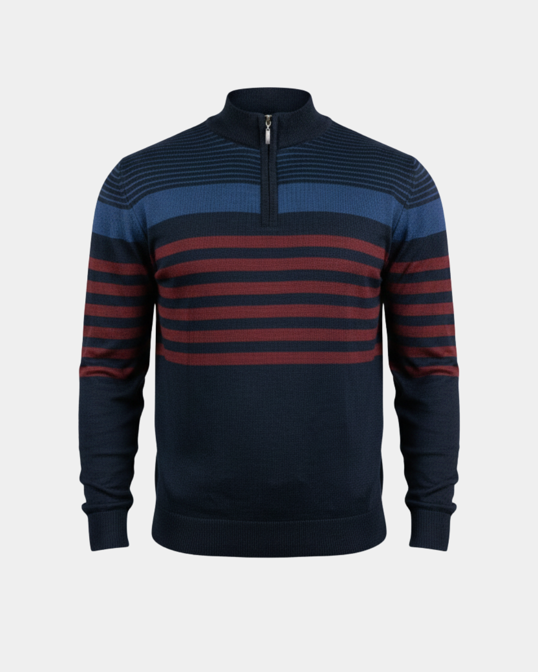 Muški džemper sa polu-zip zatvaračem izrađen od mešavine akrila i vune, koji pruža toplinu, mekoću i dugotrajnost. Moderan prugasti dizajn i udoban kroj čine ga odličnim izborom za svakodnevno nošenje.